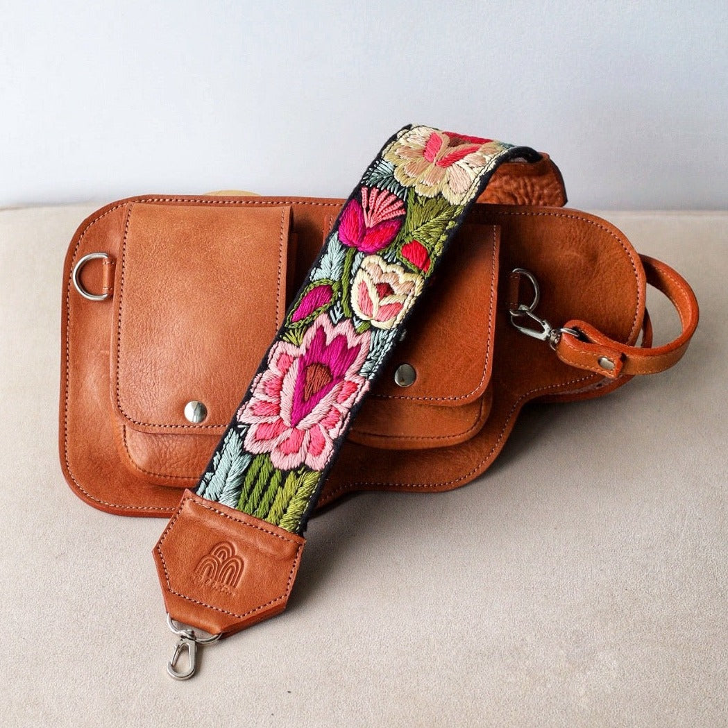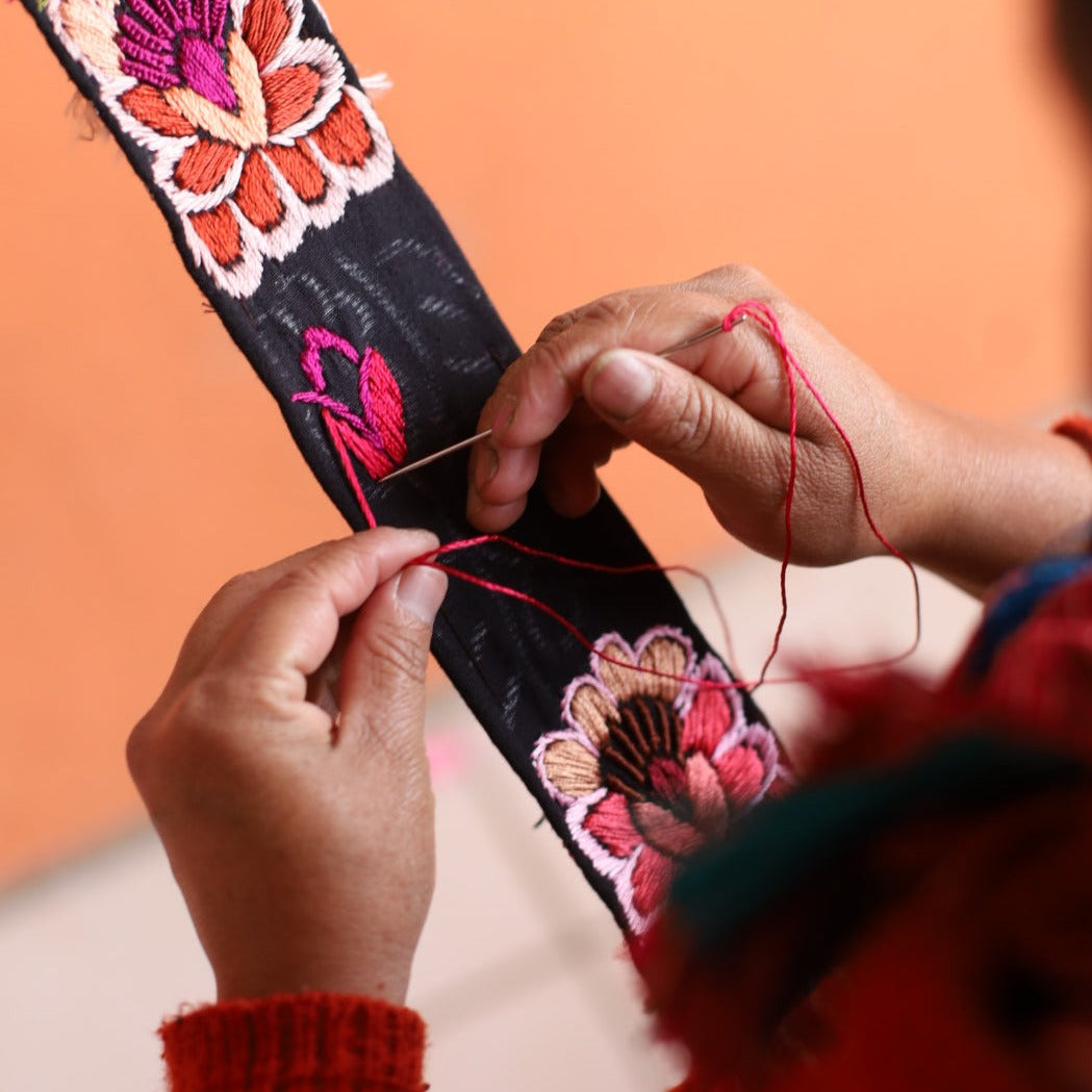 Nuestras correas están bordadas 100% a mano con mucho amor y respeto por una pequeña comunidad de mujeres en Guatemala utilizando materiales de alta calidad.