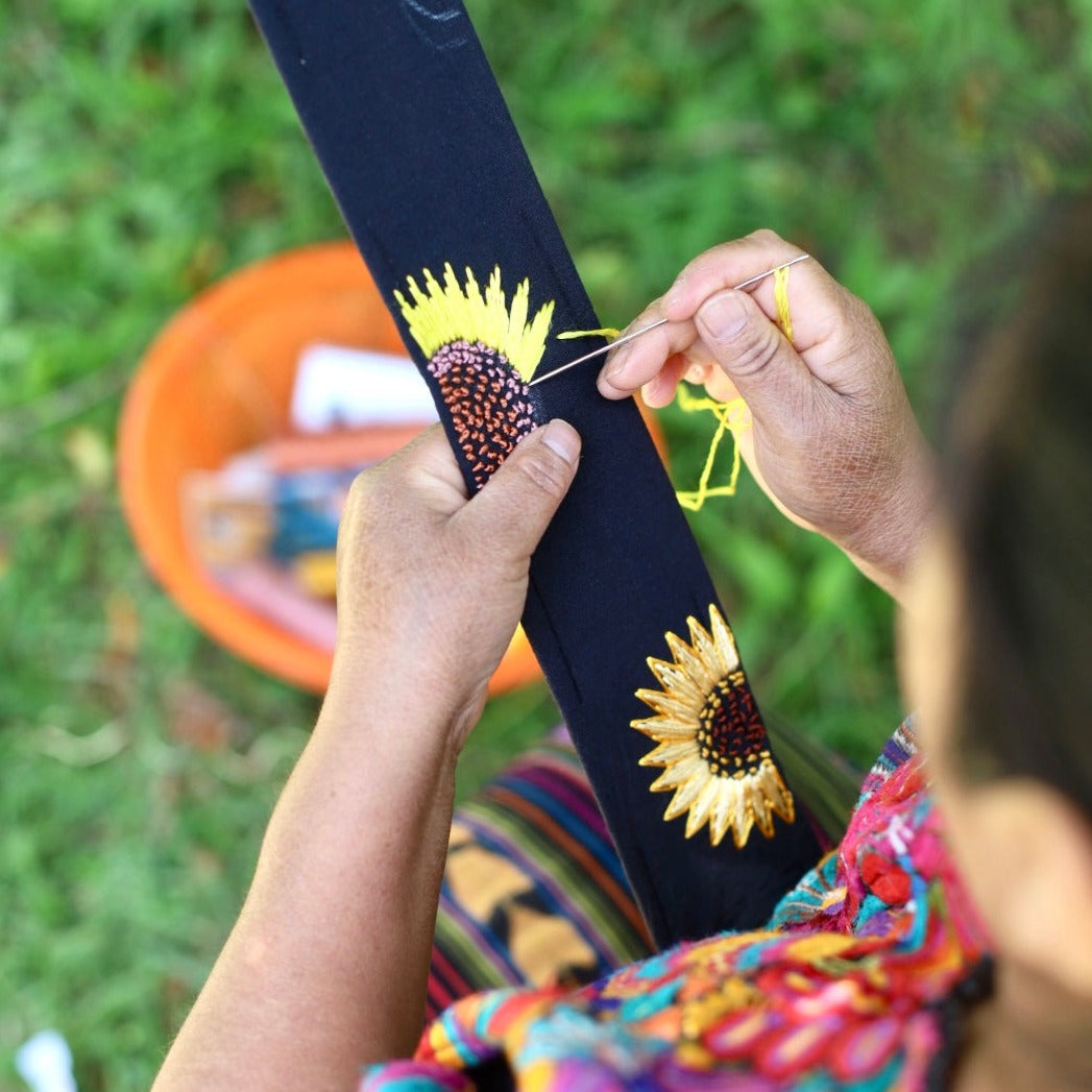 Incluye una correa bordada de 50 cm, hecha a mano en Guatemala — un detalle único que conecta la artesanía de dos culturas.